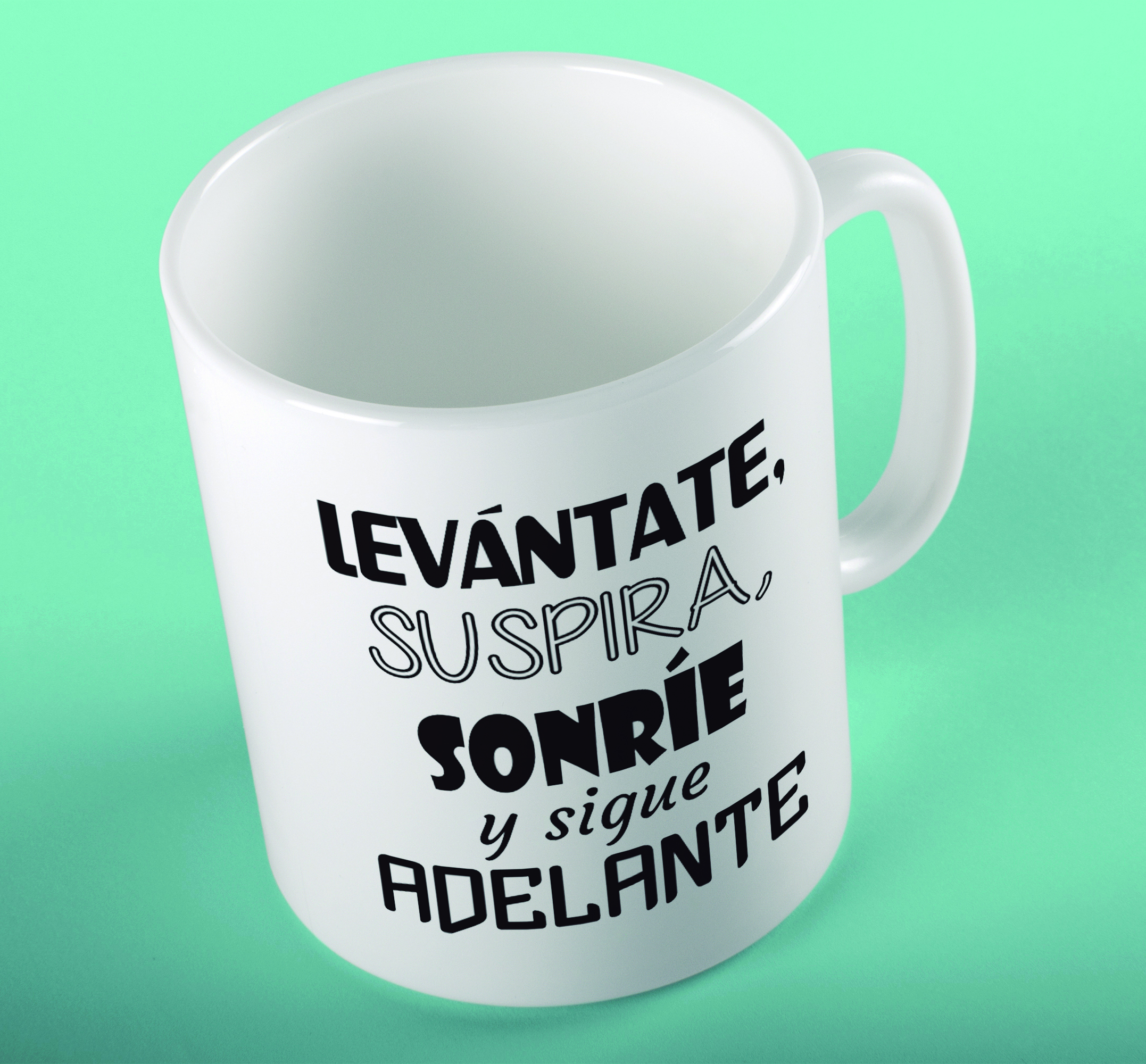 Taza blanca modelo «Levántate, suspira, sonríe y sigue adelante».